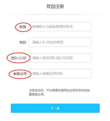 - 客服应用:请为您的客服应用命名,填写的应用名称将会在账户注册成功后自动为您创建一个客服应用,帮助您快速了解佳信客服相关功能。