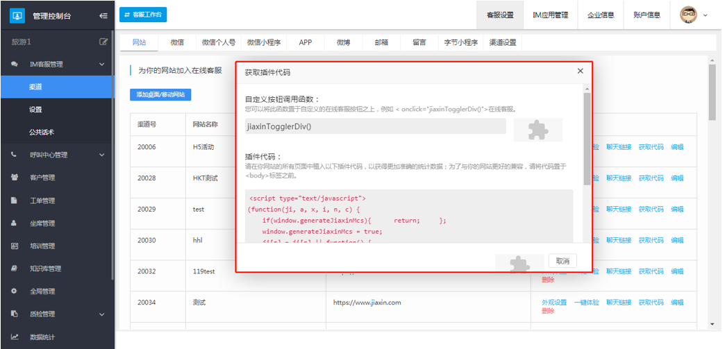 您可以在 IM客服管理的网站渠道界面创建渠道、获取插件代码并进行相关配置。
