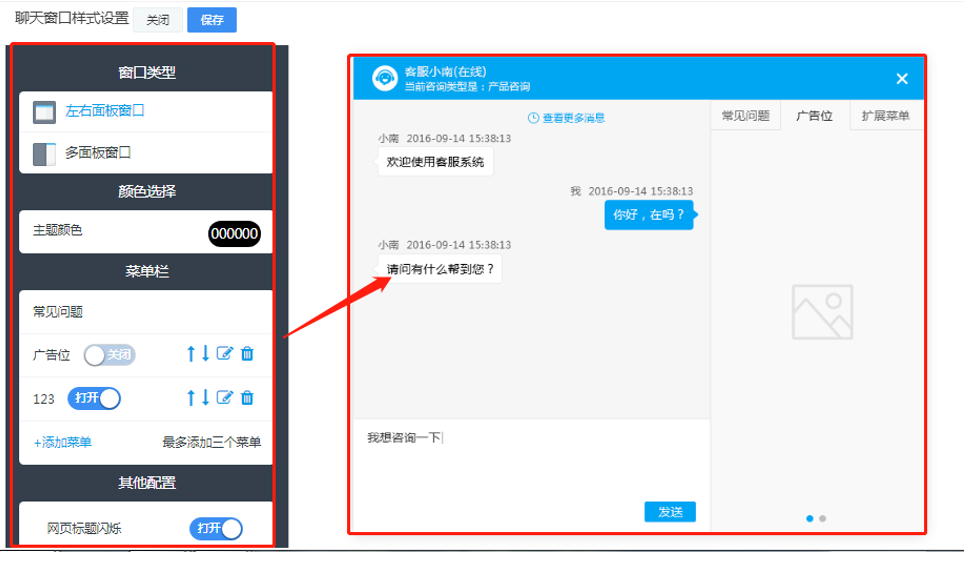 点击“修改聊天窗口样式”,进入自定义聊天窗口样式的界面。管理员可以在界面左侧选择聊天窗口的类型、颜色、新增自助服务、新增菜单栏以及网页标题闪烁的配置,右边窗口是展现设定的聊天窗口的预览效果。