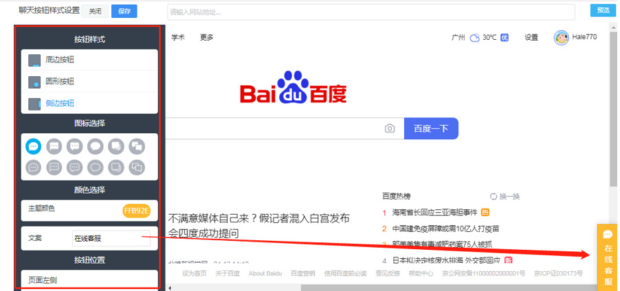 您可以简单地修改按钮的样式、图标、颜色和位置,直到它最大程度与您的网站风格统一。如下图所示,左边栏为按钮样式设置区域;在右边的浏览区域,您可以输入自己的网站域名,预览设置效果。