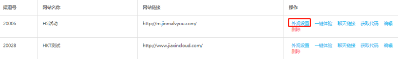 在已创建的网站渠道【操作】一栏,点击【外观设置】,进入网站插件的外观设置界面。